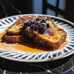 Transfer the sliced blueberry french toast to a plate and drizzle a quarter cup of maple syrup over it.