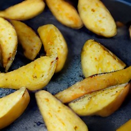Place the potato wedges on a baking tray and drizzle with canola oil. Add the chopped parsley, dried thyme, garlic powder, onion powder, cayenne pepper, and black pepper to the baking tray. Mix everything with your hand. Then place the baking tray in a hot oven. Bake for 50 minutes to get semi-roasted potato wedges.