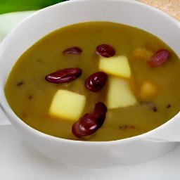 Heat the olive oil in a saucepan over medium heat. Add the minced garlic and cook for 3 minutes. Then add the drained kidney beans and vegetable broth and cook for 45 minutes over low heat. Cook for another 5 minutes after adding the chopped zucchini and frozen peas. Then remove from the heat. Transfer the soup to a bowl to serve. Stir in the pesto and salt with a wooden spoon.